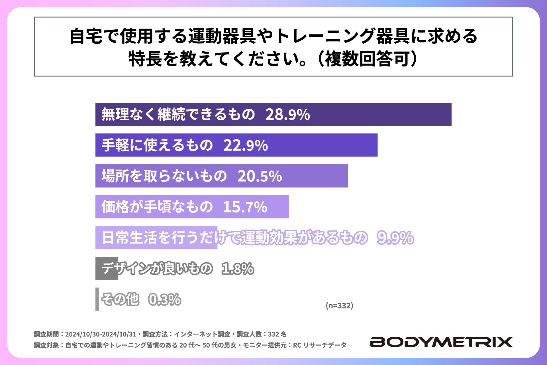 調査の最後、「自宅で使用する運動器具やトレーニング器具に求める特長を教えてほしい」という設問の回答では、1位が「無理なく継続できるもの」で28.9%、2位が「手軽に使えるもの」で22.9%、3位が「場所を取らないもの」で20.5%という結果になりました。この結果から、自宅での運動器具やトレーニング器具には無理なく継続できる手軽さを求めている方が多いことが明らかになりました。