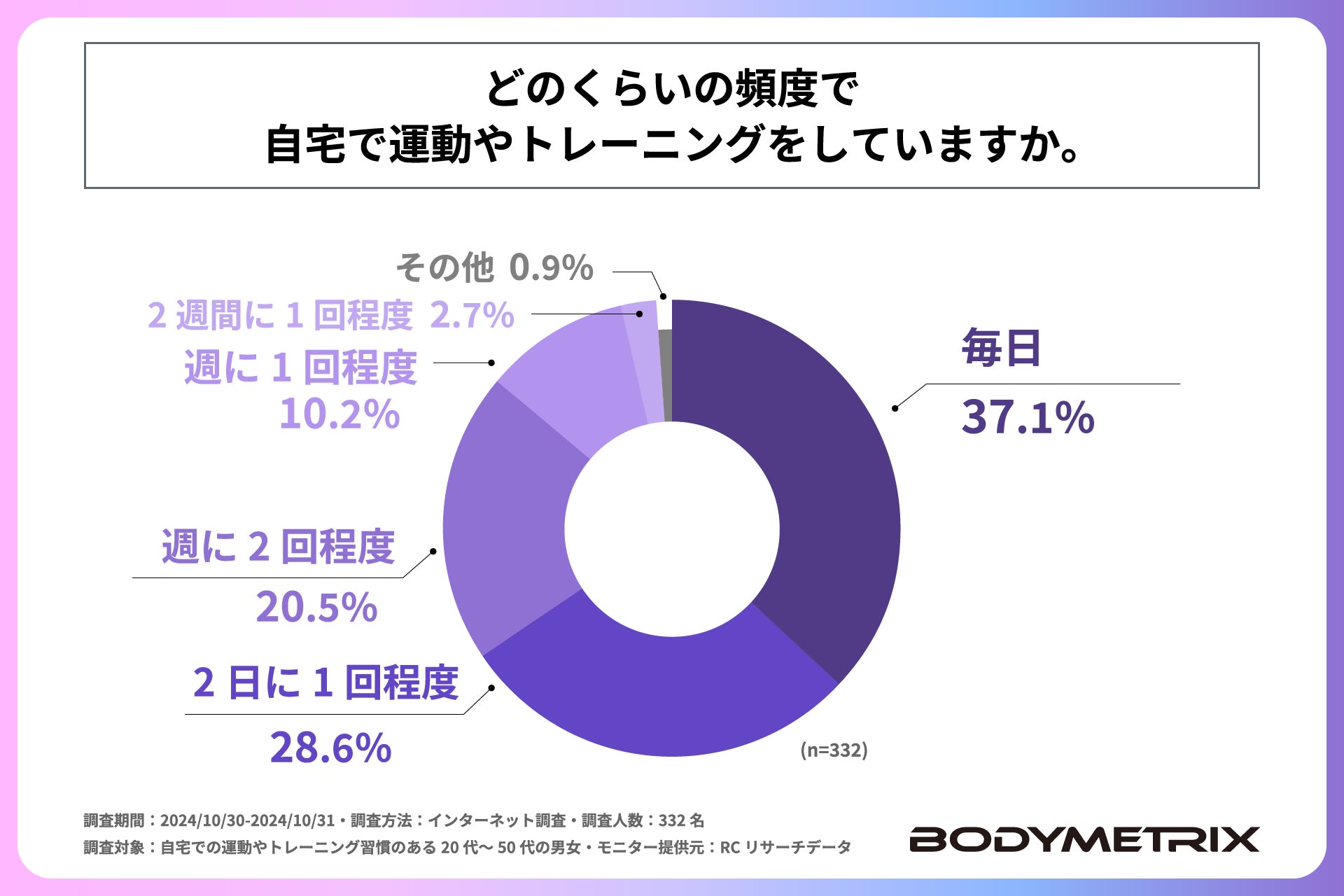 まず、「どのくらいの頻度で自宅で運動やトレーニングをしているか」を尋ねる設問への回答では、1位が「毎日」で37.1%、2位が「2日に1回」で28.6%、3位が「週に2回程度」で20.5%となりました。1位~3位の回答率を合計すると85%を超える結果となり、自宅での運動やトレーニング習慣のある人の大多数が少なくとも週2回以上は自宅で運動やトレーニングをしていることが判明しました。