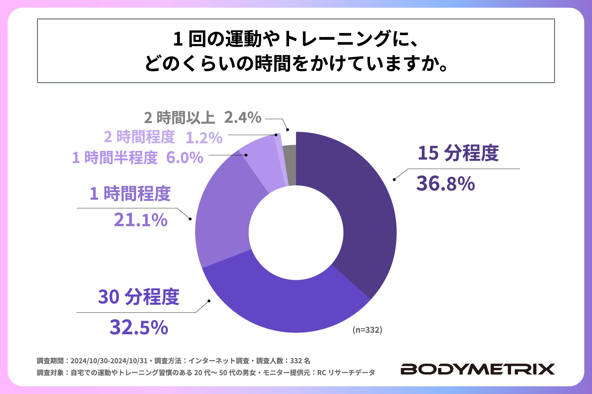次に、「1回の運動やトレーニングに、どのくらいの時間をかけているか」を尋ねる設問の回答では、1位が「15分程度」で36.8%、2位が「30分程度」で32.5%となりました。1位と2位の回答の回答率を合計すると約70%となり、自宅での運動やトレーニング習慣のある人の多くが、1回の運動やトレーニング時間は30分以下であることわかりました。