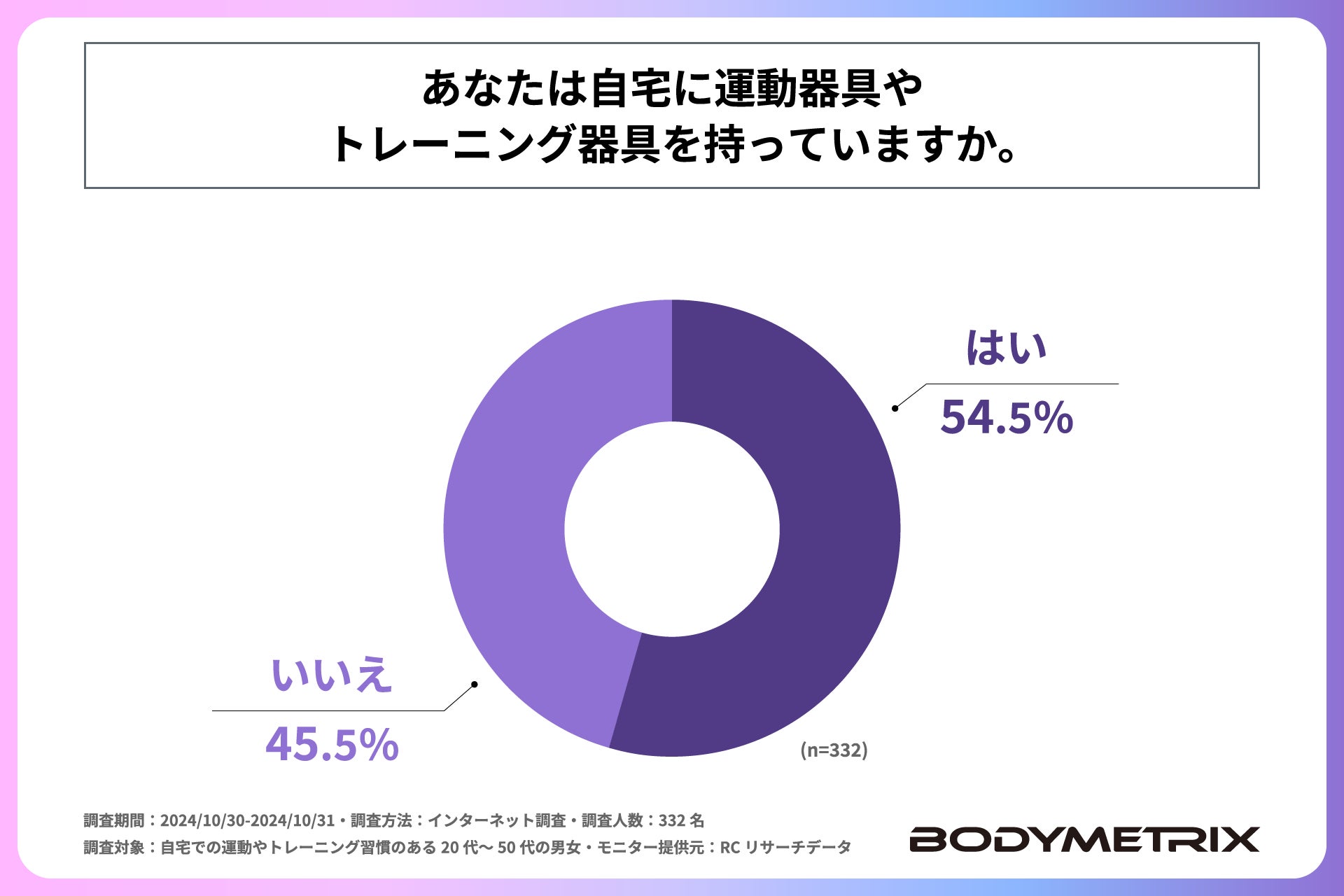 続いて「自宅に運動器具やトレーニング器具を持っているか」を問う設問への回答では「はい」が54.5%、「いいえ」が45.5%という結果になりました。この結果から、自宅での運動やトレーニング習慣のある方の5割強は自宅に運動器具やトレーニング器具を持っていることが判明しました。