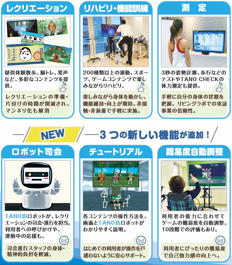 今回の展示・体験会では、介護現場の業務効率化と、利用者への質の高い支援を目的とした最新技術が紹介されます。TANOは、身体機能の維持・向上を目的とした機能訓練支援において、大きな可能性を切り拓いており、利用者が楽しみながら自然に身体を動かせる環境を提供します。
