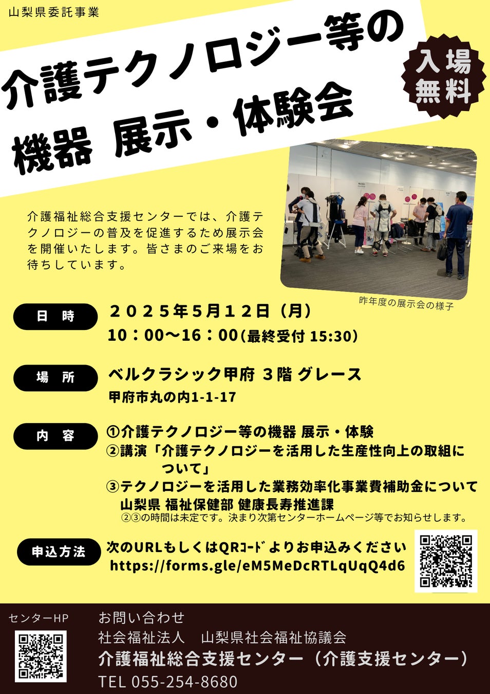 ➀介護テクノロジー等の機器 展示・体験 ②講演「介護テクノロジーを活用した生産性向上の取組について」 ③テクノロジーを活用した業務効率化事業費補助金について 山梨県 福祉保健部 健康長寿推進課 ※②③の時間は未定です。 |