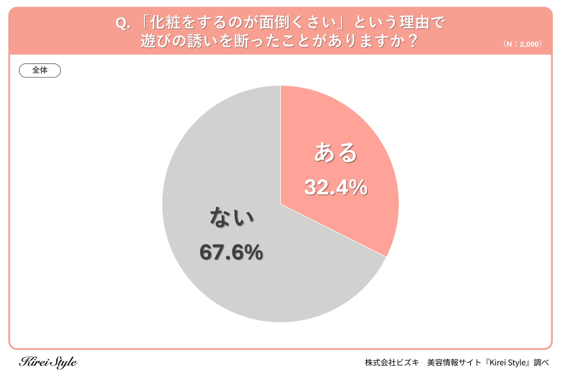 全国の20代~50代の女性2,000人を対象に、「化粧をするのが面倒くさいという理由で遊びの予定を断ったことがありますか?」というアンケートを実施したところ、「ある」と回答した方は32.4%、「ない」と回答した方は67.6%という結果になりました。