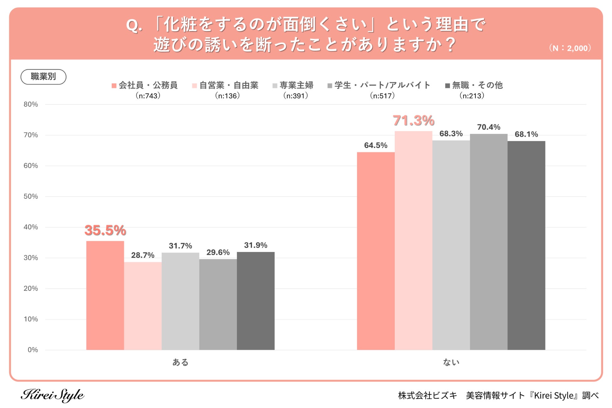 一方、自営業・自由業の場合、普段の働く時間や場所、服装や身だしなみに関する自由度が高い傾向があると言えます。会社員・公務員の方と比較すると、化粧に対するプレッシャーが相対的に低く、遊びの誘いを断る理由には繋がりにくいということが推察されました。