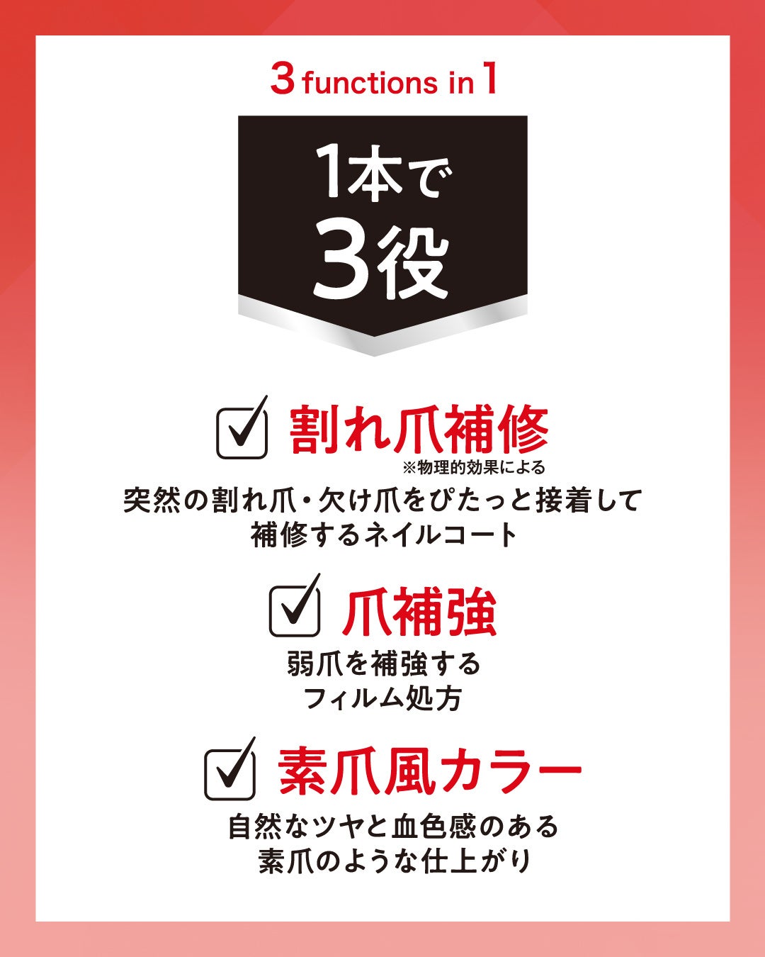 1本で補修※、補強、ネイルカラーの3役をこなす機能性が特長です。