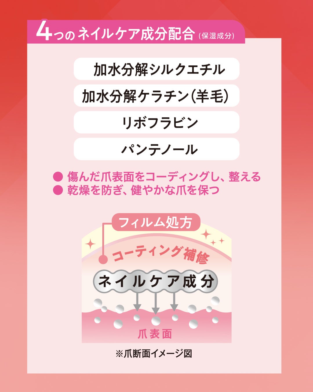 フィルム処方の被膜が、爪表面をコーティングして薄く弱い爪を補強します。