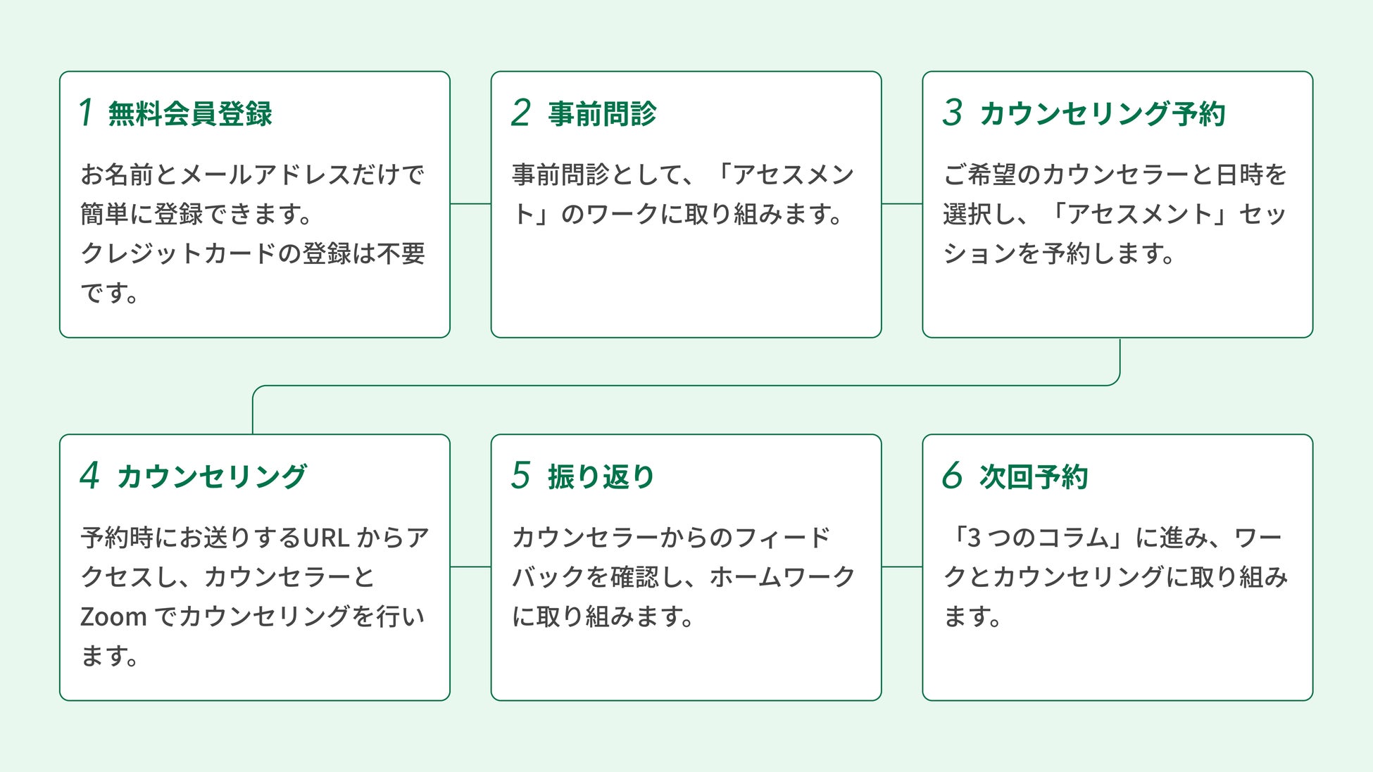 次回予約:「3つのコラム」に進み、ワークとカウンセリングに取り組みます