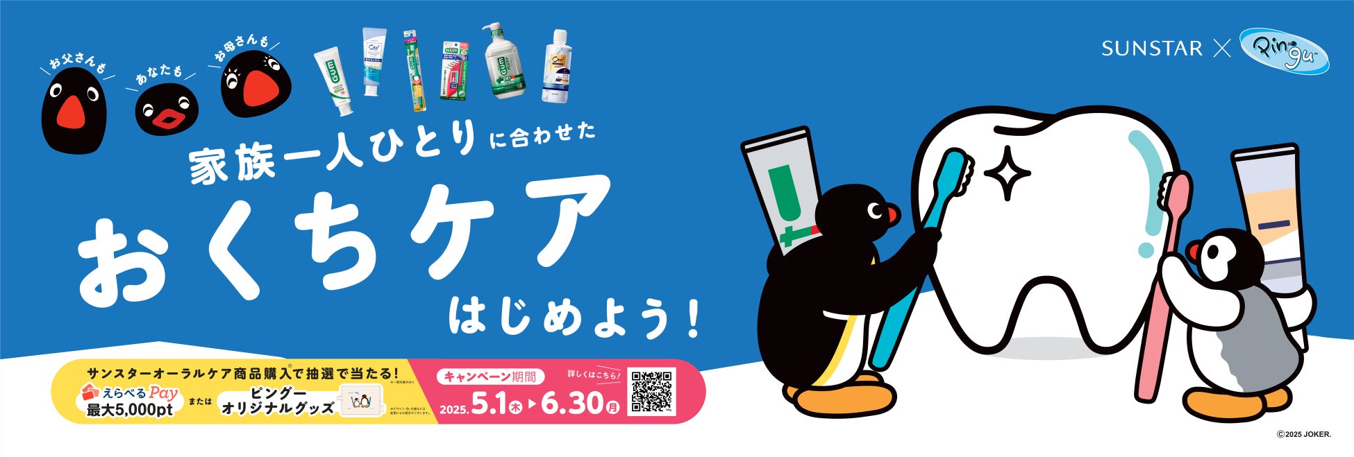 サンスターグループ(以下、サンスター)は、「家族一人ひとりに合わせた おくちケアはじめよう!キャンペーン」を2025年5月1日(木)から6月30日(月)まで実施します。本キャンペーンでは、G・U・MやOra2ブランドなどの対象製品の購入でピングーのオリジナルグッズやえらべるPayが抽選で当たります。