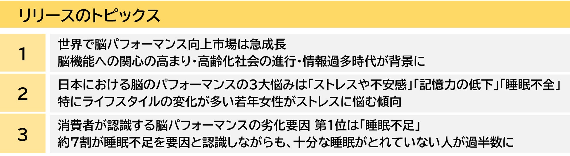 日本における脳のパフォーマンスの3大悩みは「ストレスや不安感」「記憶力の低下」「睡眠不全」特にライフスタイルの変化が多い若年女性がストレスに悩む傾向