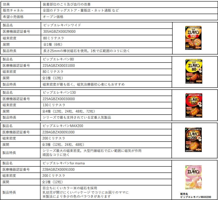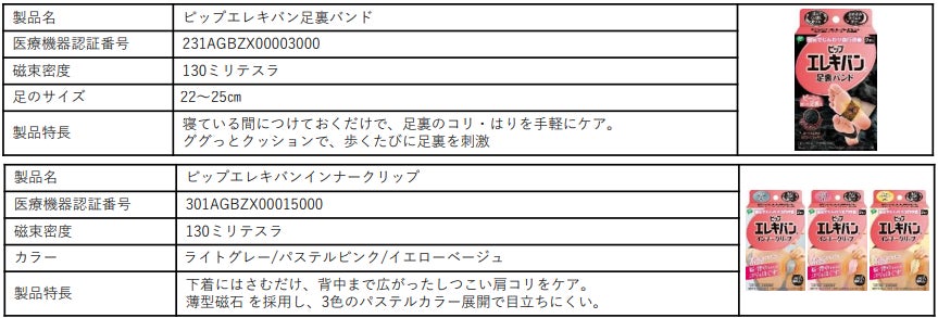 ピンポイントでコリを解消する「ピップエレキバン」。磁気が体内成分に働きかけ血行を良くし、コリの原因となる老廃物を流します。貼っている間中効果が続くので、2~5日間貼ることを推奨します。そのままお風呂にも入れます。磁力の強さを選べるため、コリの状態によって使い分けが可能。こっているな、と思うところを指で軽く押さえ「少し痛い、気持ちいい」と感じるところに貼ったり、必要に応じてその周囲にご使用ください。その他、着けるだけで足裏のコリ・はりを手軽にケアする「ピップエレキバン足裏バンド」や、背中まで広がったしつこい肩コリにアプローチする「ピップエレキバンインナークリップ」といった貼らないタイプの商品も展開しています。
