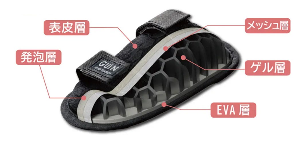 • ゲル層:ハニカム構造のゲルによりアーチ部にしっかりフィットしアーチ部にかかる負担を吸収しつつ運動効率を高めます。ハニカムゲルの接着加工は他社では難しい独自技術です。