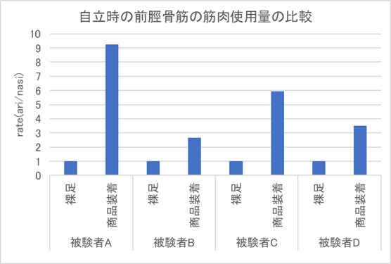 自立時の前脛骨筋の筋肉使用量の比較(裸足で自立時を1とし、商品装着状態で自立時の筋肉使用量の増加率)