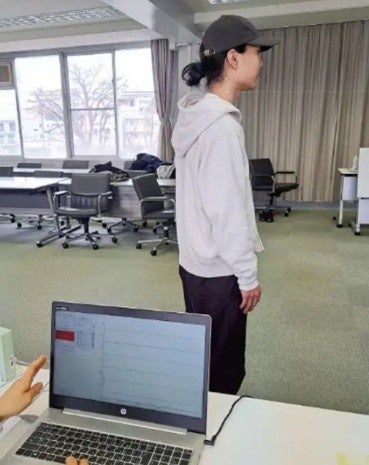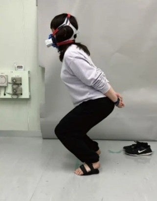60秒間のスクワット運動を行い、運動中(60秒)および運動後の立位安静状態(60秒)の計120秒間の呼気代謝量を測定し、測定値よりエネルギー消費量を算出。裸足時と商品装着時の増加率は最大160%。