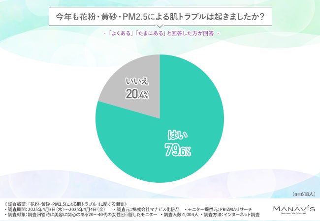 先程の質問で『よくある』『たまにある』と回答した方に、「今年も花粉・黄砂・PM2.5による肌トラブルが起きたか」を尋ねたところ、『はい(79.6%)』と回答した方が大多数を占めました。