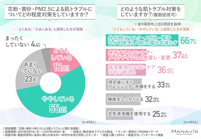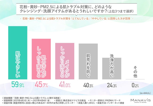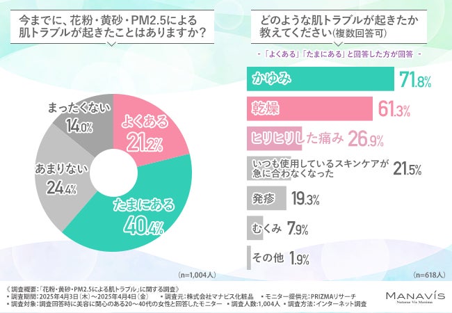 そこで今回、「マナビス スキンクレンジングオイル」(https://manavis.store/products/1044)を展開する株式会社マナビス化粧品は、美容に関心のある20~40代の女性を対象に、「花粉・黄砂・PM2.5による肌トラブル」に関する調査を実施しました。