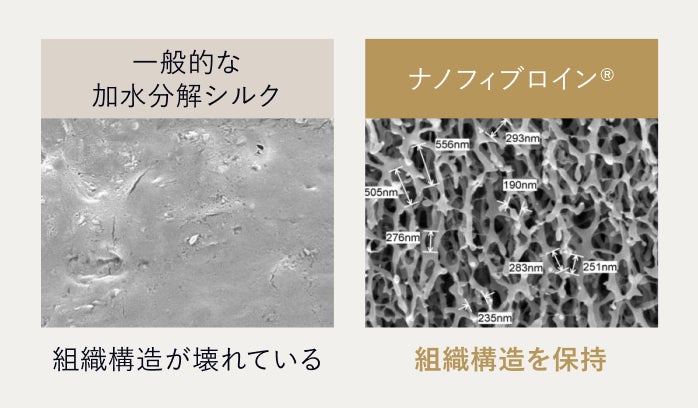 ナノフィブロイン®︎とは、特許技術※1により従来の加⽔分解シルクでは失われがちだった精緻な網⽬構造を保持した、高純度の水溶性フィブロインタンパク。シルク本来の⾼い保湿性、UVカット、メラニン抑制、そしてコーティング機能を実現。