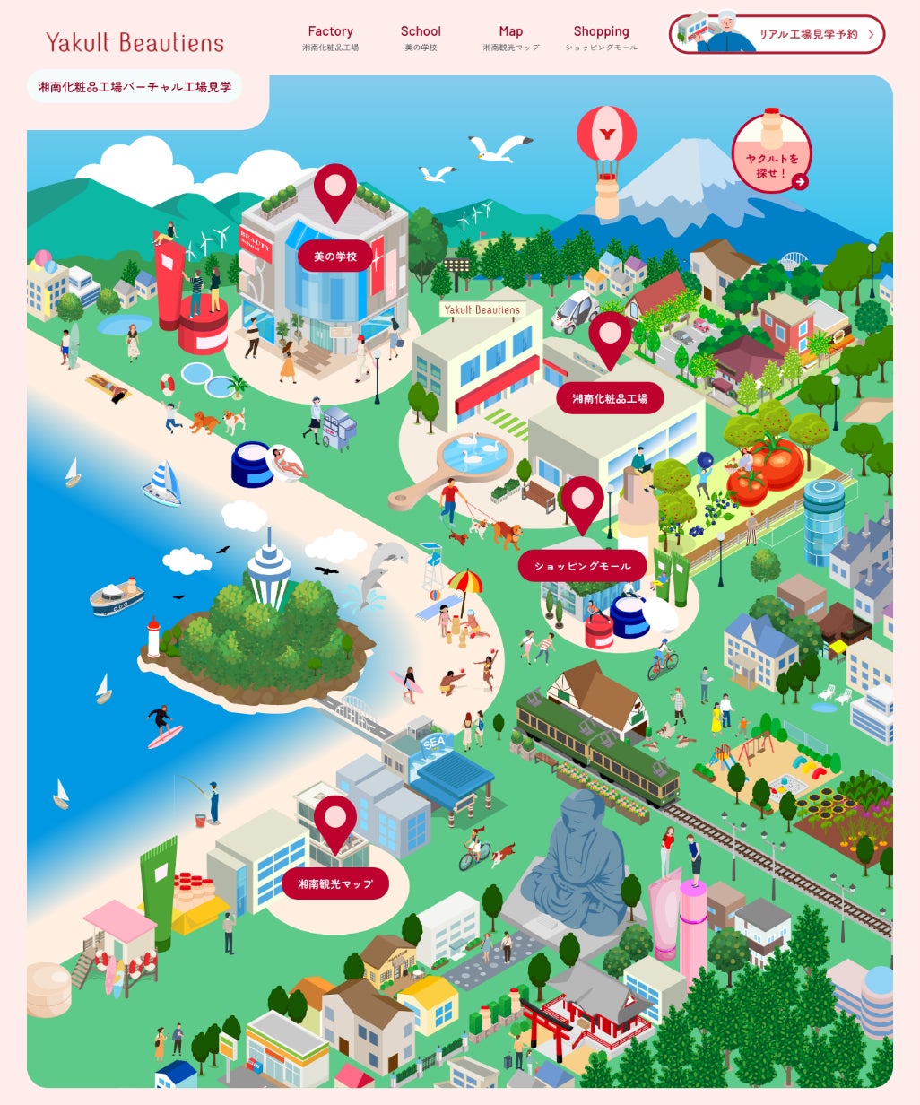 TOPページには、湘南地域をイメージしたバーチャルタウン「ヤクルト ビューティエンスタウ