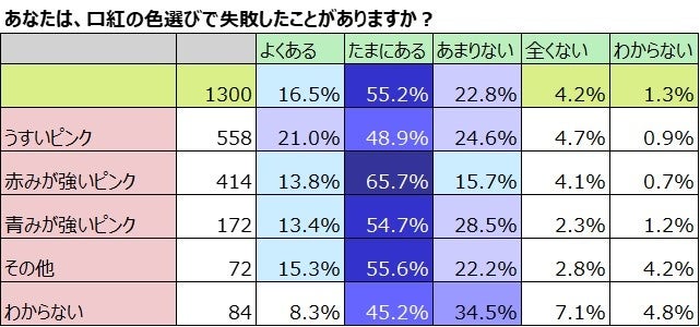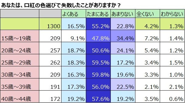 口紅の色選びで失敗したことがあるか否か聞きました。全体では、「よくある」16.5%と「たまにある」55.2%を合わせた71.7%と7割を超える人が口紅選びで失敗経験があると答えています。「全くない」は4.2%にとどまりました。