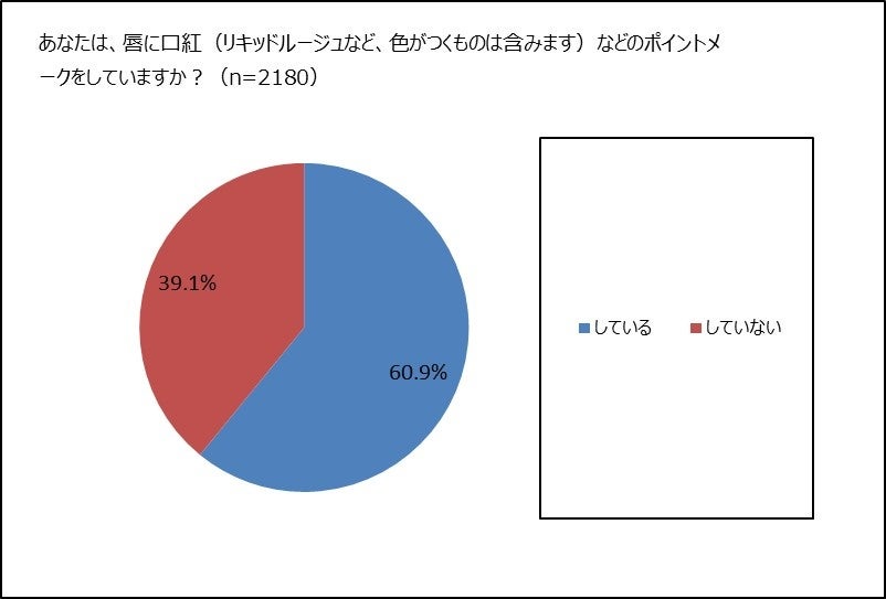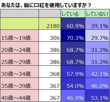 全国の15歳~44歳の2,180名の女性に口紅(色がつくリップカラー類すべて)を使用しているか否か聞きました。全体では、「している」が60.9%、「していない」が39.1%でした。これを年齢別に見てみました。最も使用しているのは15歳~19歳で70.3%、20歳~29歳もほぼ同様で68.7%と約7割です。年齢を重ねると使用している人の割合が減少していき、30歳~34歳では57.9%と6割を切り、40歳~44歳になると46.9%と半数を下回る結果となりました。