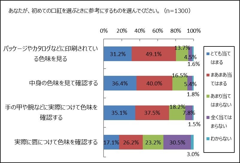 最後に、初めて口紅を選ぶときに参考にするものを選んでもらいました。「パッケージやカタログなどに印刷されている色味を見る」は、「とても当てはまる」31.2%、「まあまあ当てはまる」49.1%で、合わせると参考にしているのは80.3%でした。「中身の色味を見て確認する」は、「とても当てはまる」36.4%、「まあまあ当てはまる」40.0%で、合わせると76.4%でした。「手の甲や腕などに実際につけて色味を確認する」は、「とても当てはまる」35.1%、「まあまあ当てはまる」37.5%で合わせると72.6%、ともに7割を超える人が参考にしています。「実際に唇につけて色味を確認する」を見てみると、「とても当てはまる」17.1%、「まあまあ当てはまる」は26.2%で、合わせても43.3%で半数にも満たない反面「あまり当てはまらない」23.2%と「全く当てはまらない」30.5%で合わせると53.7%と半数を超える女性が初めての口紅を選ぶ際にも実際に唇へ試し塗りせずに購入していることがわかりました。