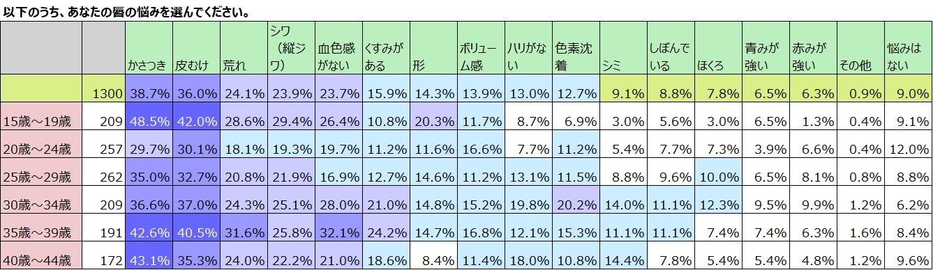 次に唇の悩みについて聞きました。(複数選択のため、合計が100%にはなりません。)その結果「かさつき」、「皮むけ」、「荒れ」といった唇の乾燥から由来する悩みが上位をしめました。続くのがシワ(縦ジワ)で、年齢を問わず悩みとして挙げられています。その次には「血色感がない」「くすみがある」など、色味に関する悩みが多いようです。当社では調査前に「ボリューム感」など形状に関わる悩みの方が上位になると予想していましたが、色味に関する悩みは上記以外にも「色素沈着」、「シミ」、「ほくろ」、「青みが強い」、「赤みが強い」など多岐にわたることがわかりました。