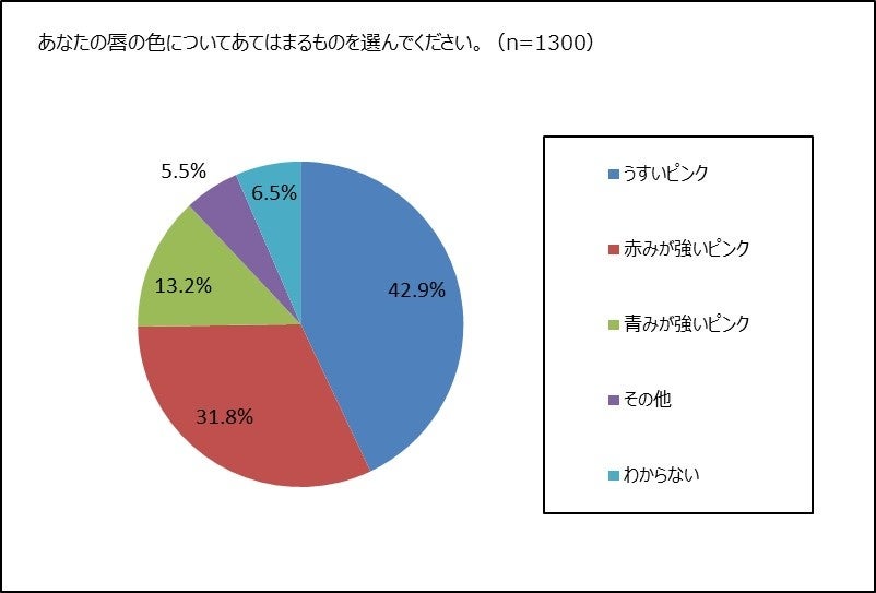 また唇の色味についての悩みが多かったため、唇の色と口紅の悩みがリンクするのか確認するためご自身の唇の色味を聞きました。最も多いのが「うすいピンク」で42.9%でした。上記の質問で唇の悩みについて、「青みが強い」が6.5%、「赤みが強い」が6.3%でほぼ同率でしたが、ご自身の唇の色味でわけると「赤みが強いピンク」が31.8%、「青みが強いピンク」が13.2%と大きな差がありました。
