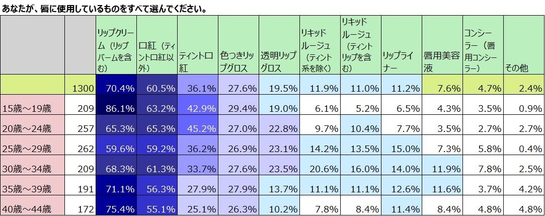 「ティント口紅」の使用者は約4割。若年層ほど使用率が高く、年齢を重ねるほど減少。