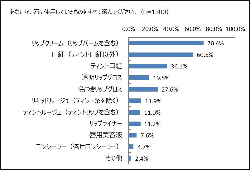 口紅を「使用している」と答えた1,300名の女性に唇に使用しているものを選んでもらいました。(複数選択のため、合計が100%にはなりません。)1位はリップクリーム(リップバームを含む)で70.4%と7割を超えます。2位に続くのが、「口紅(ティント口紅以外)」で60.5%、韓国メークの流行などもあり、近年増加してきた「ティント口紅」も3位で36.1%と4割に迫ります。その次に続くのが「色つきリップグロス」で27.6%でした。