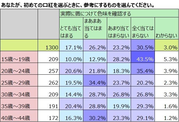 これを年齢別に掛け合わせて見てみました。15歳~19歳の若年層は、実際に口紅につけて色味を確認するのは、「とてもあてはまる」10.0%と「まあまあ当てはまる」12.9%、合わせても22.9%にとどまり反対に「あまり当てはまらない」28.2%と「全く当てはまらない」43.5%で71.7%と7割を超えて試し塗りをせずに初めての口紅を購入している事実がわかりました。手の甲などに試し塗りをしているのは7割を超えるにもかかわらず唇に塗っているのは4割程度にとどまっています。20歳以上の世代でも唇に試してから買う派が試さずに買う派を上回るのは25歳~29歳だけで、それ以外の年代はすべて同率もしくは試さずに買う派の方が多いことがわかりました。