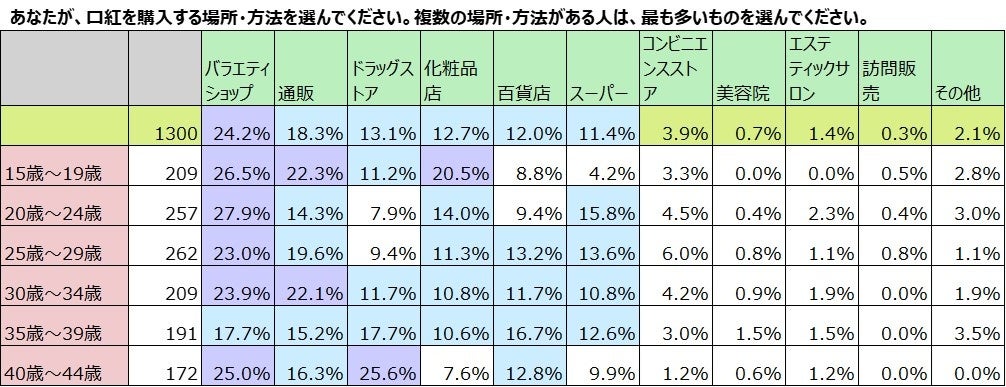口紅を使用している1,300名の女性に口紅を購入する方法(場所)について聞きました。複数の方法がある人は、最も多いものを選んでもらいました。全体では「バラエティショップ」が多く、24.2%と4人にひとりの割合です。40歳~44歳は「バラエティショップ」25.0%、「ドラッグストア」25.6%で「ドラッグストア」が1位ですが、それ以外の年代はすべて、最も多く口紅を購入する方法として「バラエティショップ」を選んでいます。「バラエティショップ」を最も多い購入方法として選んだ人に個別で理由を確認をすると、「ブランドの比較がしやすい」、「テスターが充実している」、「店内でゆっくり選べる」といった声がありました。注目すべきは、実際に試し塗りなどができない「通販」が2位になっていることで、15歳~19歳や30歳~34歳の複数の世代で2割を超えています。「百貨店」で購入する割合は全体で12.0%、25歳以上の世代は1割を超えますが、15歳~24歳の世代は1割を下回りました。「スーパー」や「コンビニエンスストア」は、テスターなどが置かれていない環境であることも多いですが、一定数の購入者率があり、特に「スーパー」は20歳~39歳の世代はすべて1割を超えています。こちらも選択した人に個別で理由を確認すると、「決まったものを買っているから」や「食料などの買い物のついでに買う」といった声があがりました。