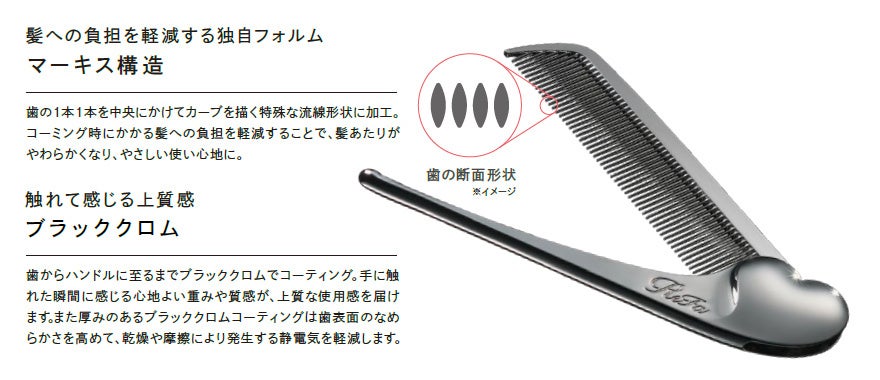 髪への負担を軽減しながら、前髪やおくれ毛などの細かな毛束もとらえて整え、髪にツヤとまとまりを与えます。お手入れ用のクロスと専用ポーチが付属されているので、いつでも手軽にお手入れでき、持ち運びにも便利な折りたたみ式コームです。