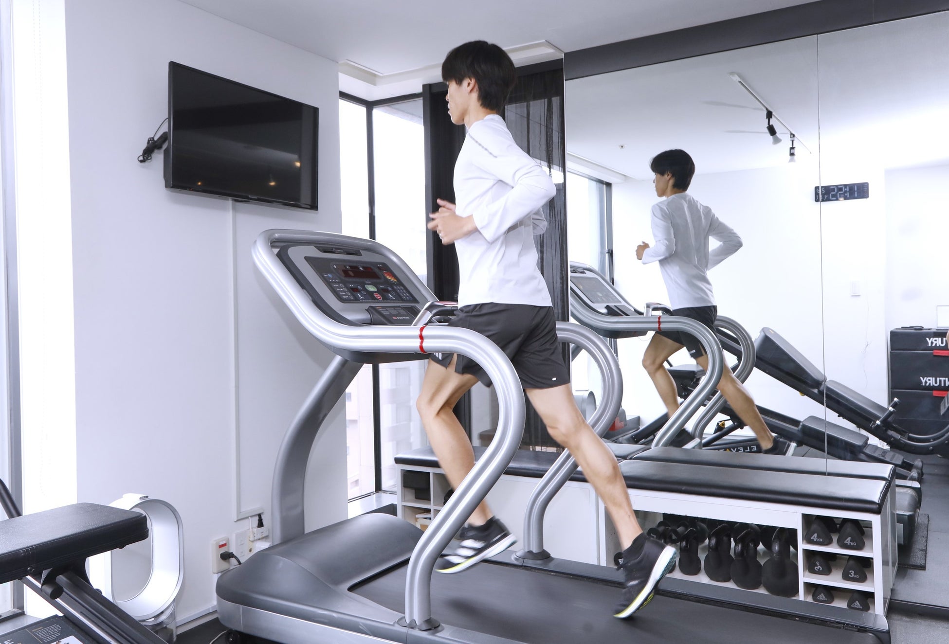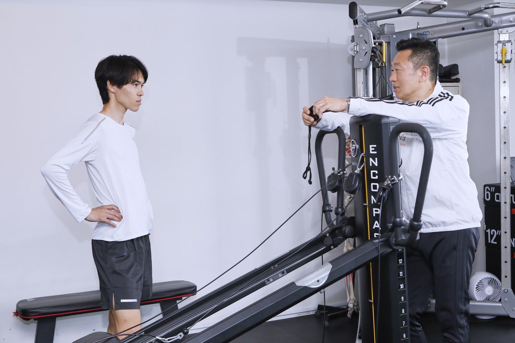ランニングマシーンでウォーミングアップを行った後は、青学駅伝部に所属していた時よりフィジカルトレーニングに取り入れている画期的なトレーニングマシンENCOMPASSを使ったトレーニングを。トレーニング内容はその日のコンディションや今後のスケジュールなどを考慮して常にカスタマイズ。