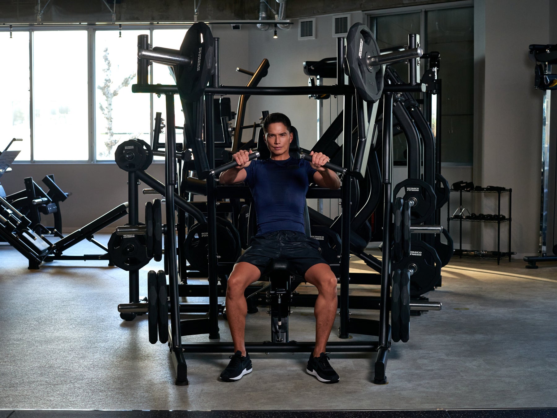 開放的なトレーニングスペースや洗練されたマシン配置が、市原さんの自然な動きや表情と相まって、ECOFIT24が目指す“自分らしさを大切にできるフィットネス空間”をリアルに映し出しています。