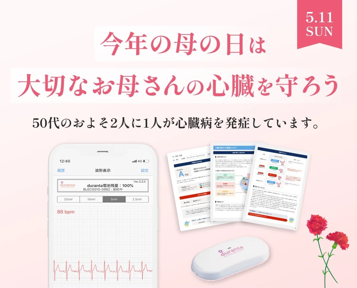 「病気で後悔しない社会へ」をミッションに掲げ、自宅で長時間の心電図検査をすることで心臓病の早期発見が可能な「ホーム心臓ドック®」を提供している株式会社ココロミル(本社:東京都新宿区、代表取締役社長:林大貴、以下「ココロミル」)は、自宅で長時間の心電図検査をすることで心臓病の早期発見が可能な「ホーム心臓ドック®」 シリーズの商品が最大20%OFFになる母の日キャンペーンを2025年5月16日(金)まで実施いたします。本キャンペーンは、日頃から家族の健康を支えているお母さんへ、家族から心疾患の予防や早期発見につながるきっかけを贈っていただきたいという想いから企画した特別なキャンペーンとなります。