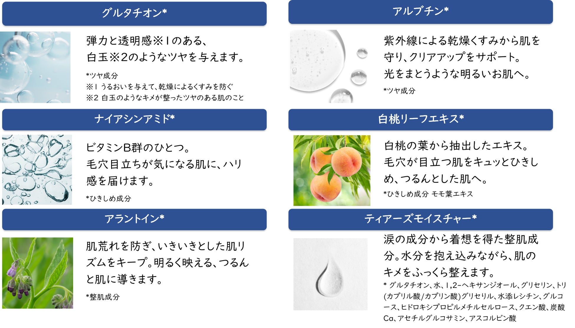 *1 製品の抗酸化剤 ヒドロキシデシルユビキノン *2 ひきしめ成分:ナイアシンアミド、モモ葉エキス