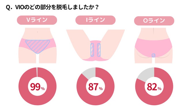最も多いのは「Vライン(99%)」と、VIO脱毛する方のほとんどが脱毛していました。毛量や形を整えたいと考える方が多いというのが、結果として表れています。