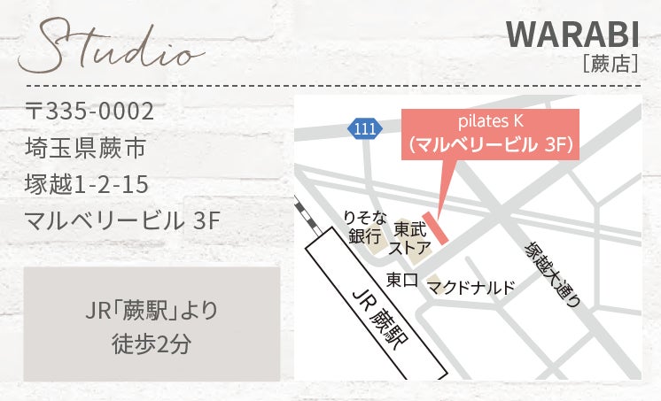 pilates K 蕨店は、埼玉県蕨市に位置する女性専用マシンピラティススタジオです。JR「蕨駅」から徒歩2分の利便性の高い立地にあり、平日は仕事帰りに、休日はショッピングの合間に気軽に立ち寄ることができます。日常生活の中で無理なく通える環境が整っているため、継続しやすいのが特長です。