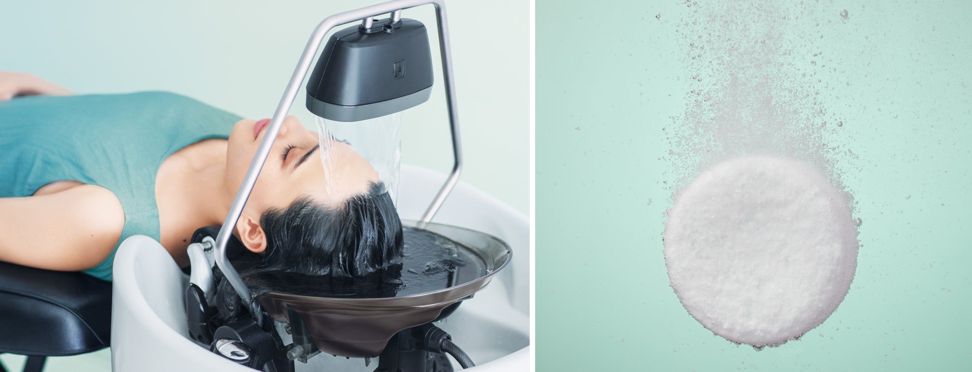 フェイスラインからお湯をかけ流しながら後頭部~首元をお湯に浸し、日常では体験できない癒しのひとときへと誘うサロン向けスパメニュー。たった5分で気持ちを整えるスイッチになります。炭酸と組み合わせて使用し、ヘッドスパやカラーケアの価値向上に貢献。頭全体をお湯で包みこむので、素早く全体に炭酸成分を行き渡らせることができ、炭酸の作用効率が大幅にアップします。