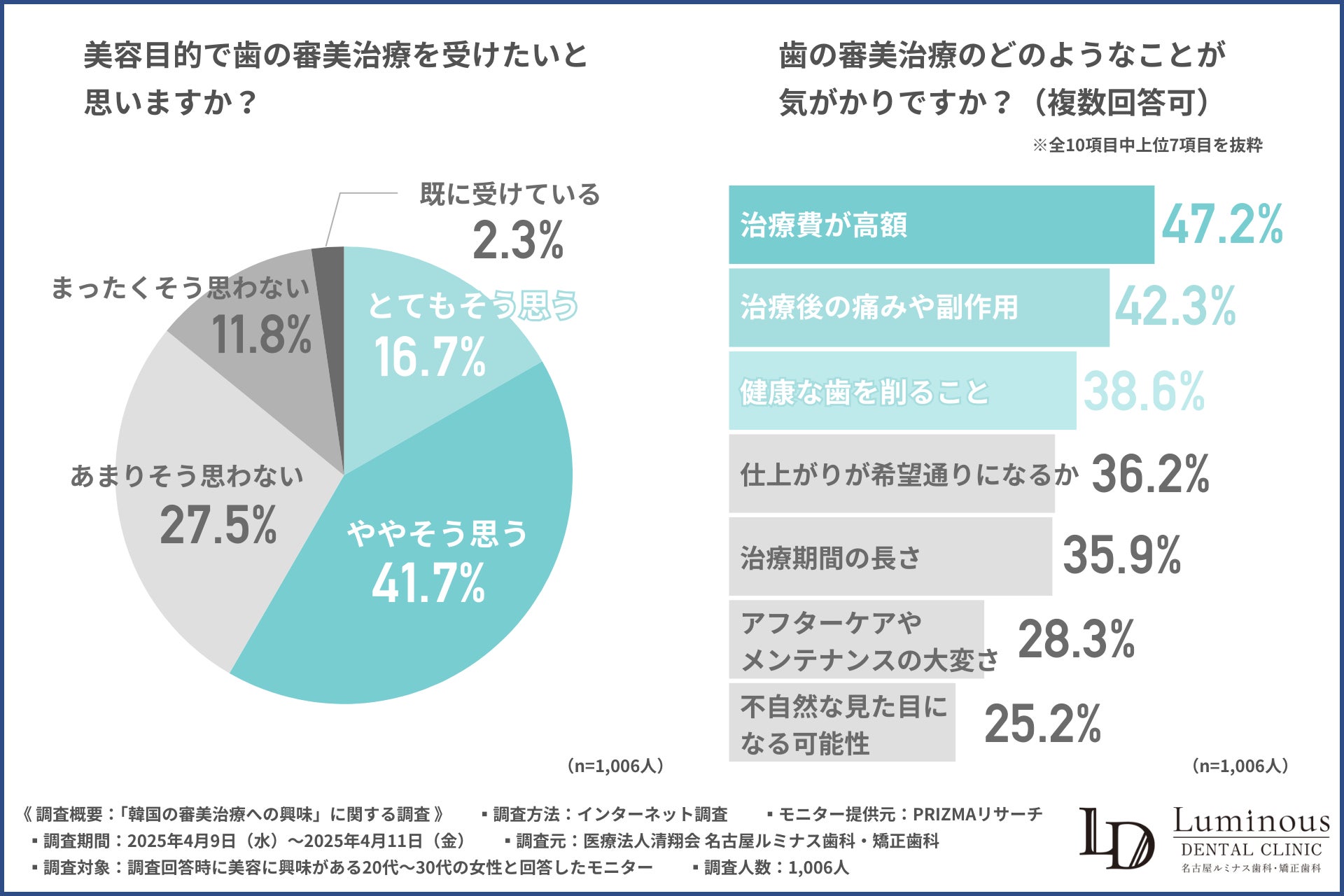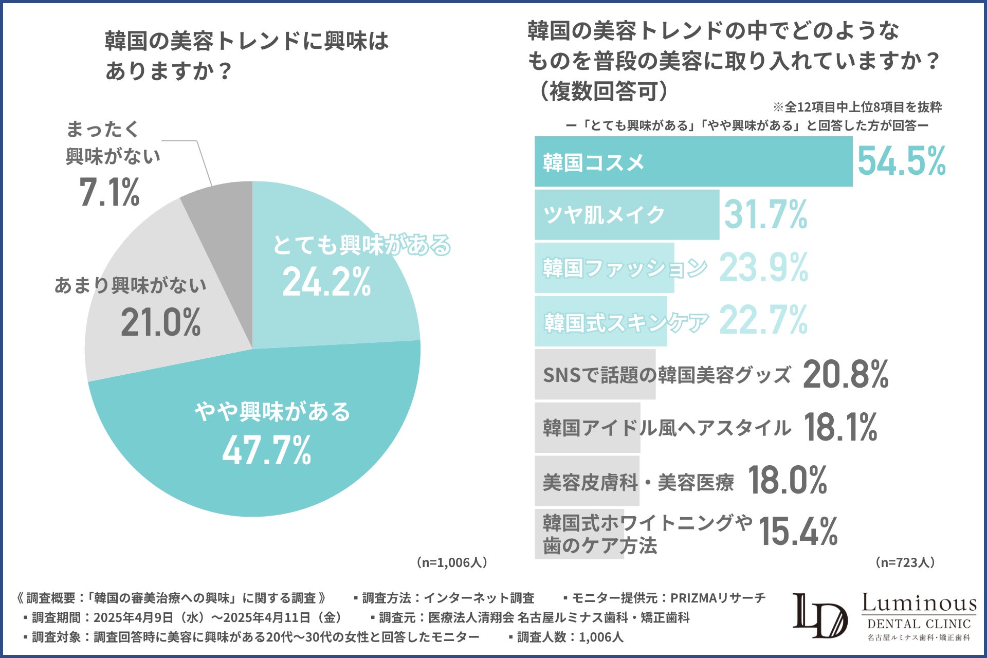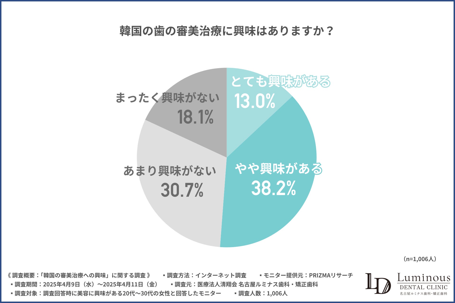 そこで今回、医療法人清翔会 名古屋ルミナス歯科・矯正歯科(https://www.nagoya-luminous-official.com/)は、美容に興味がある20代~30代の女性を対象に、「韓国の審美治療への興味」に関する調査を実施しました。