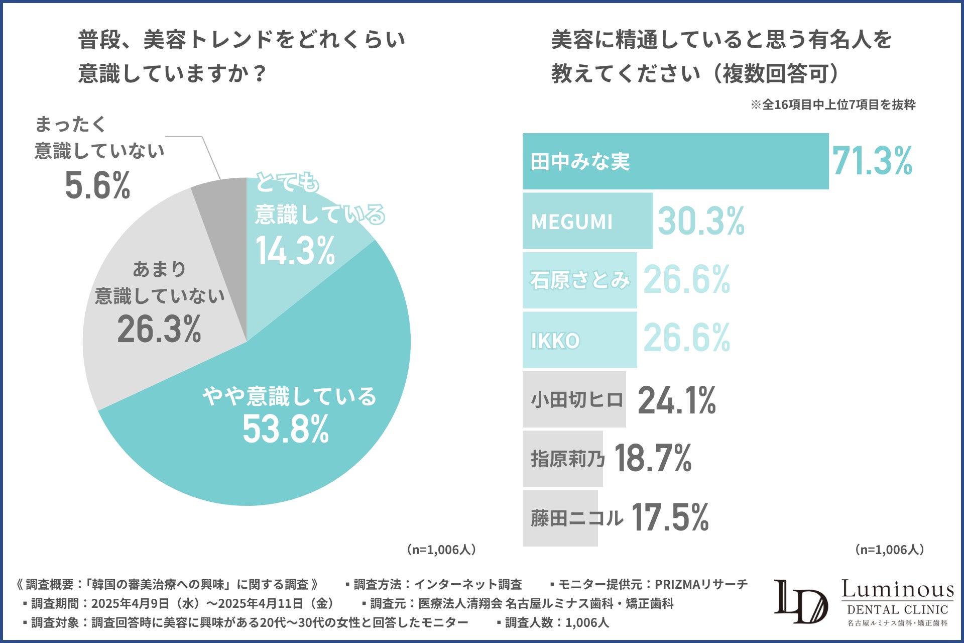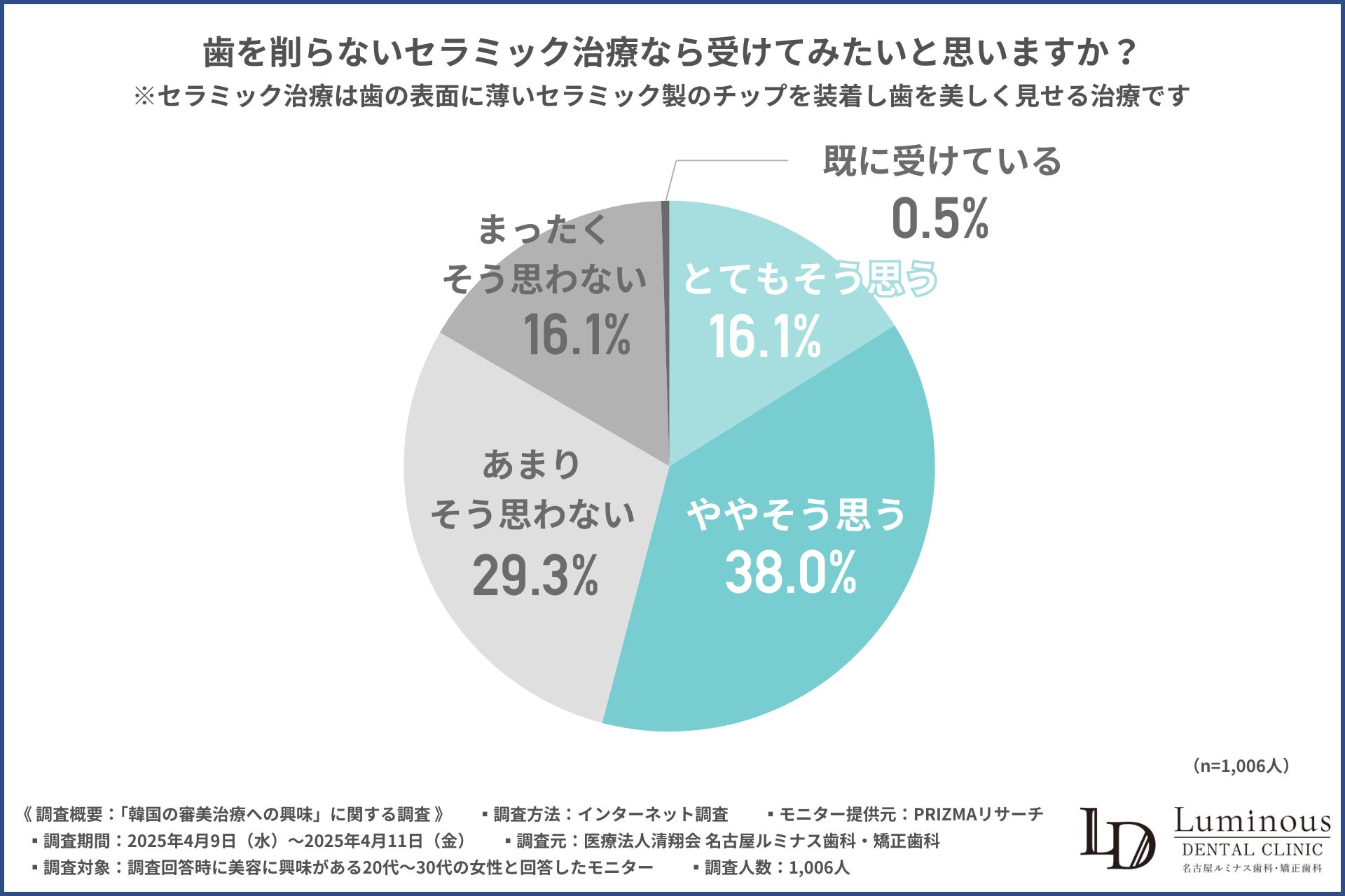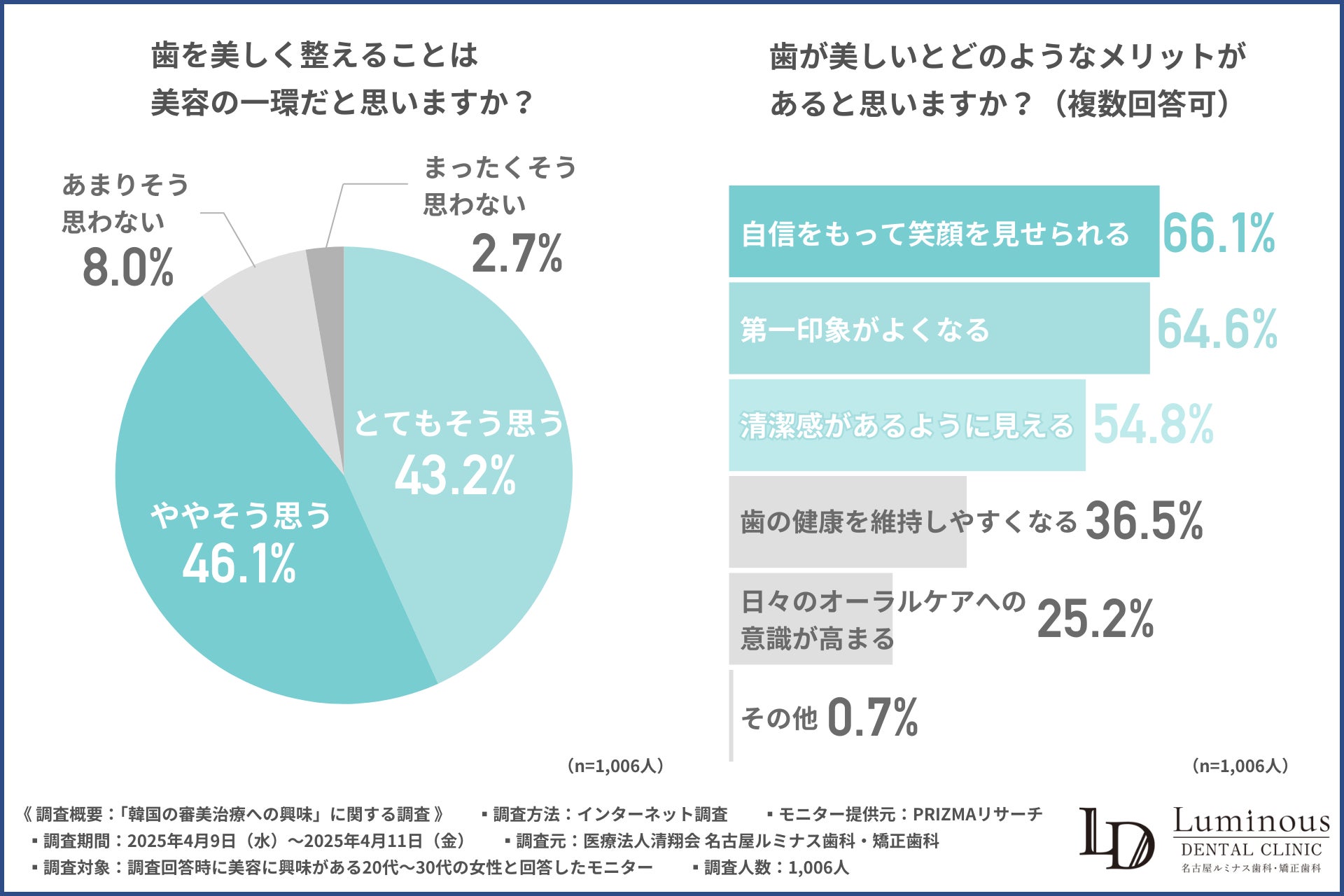 そこで今回、医療法人清翔会 名古屋ルミナス歯科・矯正歯科(https://www.nagoya-luminous-official.com/)は、美容に興味がある20代~30代の女性を対象に、「韓国の審美治療への興味」に関する調査を実施しました。
