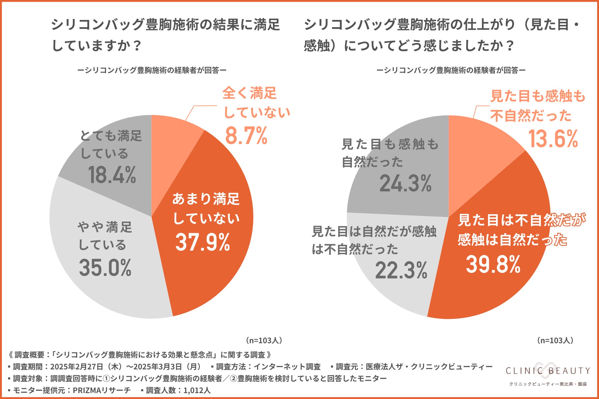 一方で、シリコンバッグ豊胸施術経験者の約半数が、見た目や感触の不自然さから施術後の結果に満足していないことがわかりました。