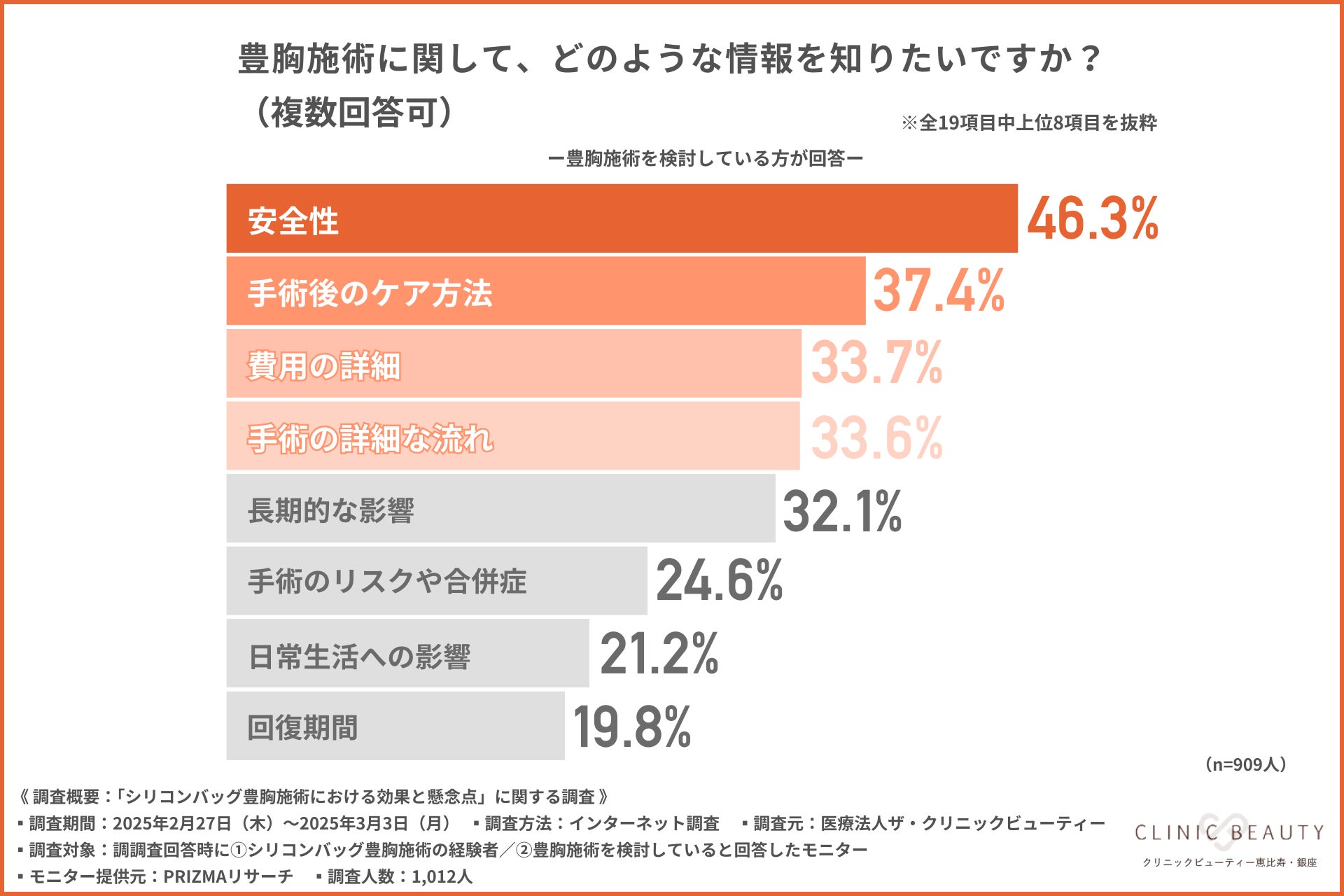 「豊胸施術(通称:豊胸手術)に関して、どのような情報を知りたいですか?(複数回答可)」と質問したところ、『安全性(46.3%)』と回答した方が最も多く、次いで『施術後のケア方法(37.4%)』『費用の詳細(33.7%)』『施術の詳細な流れ(33.6%)』となりました。