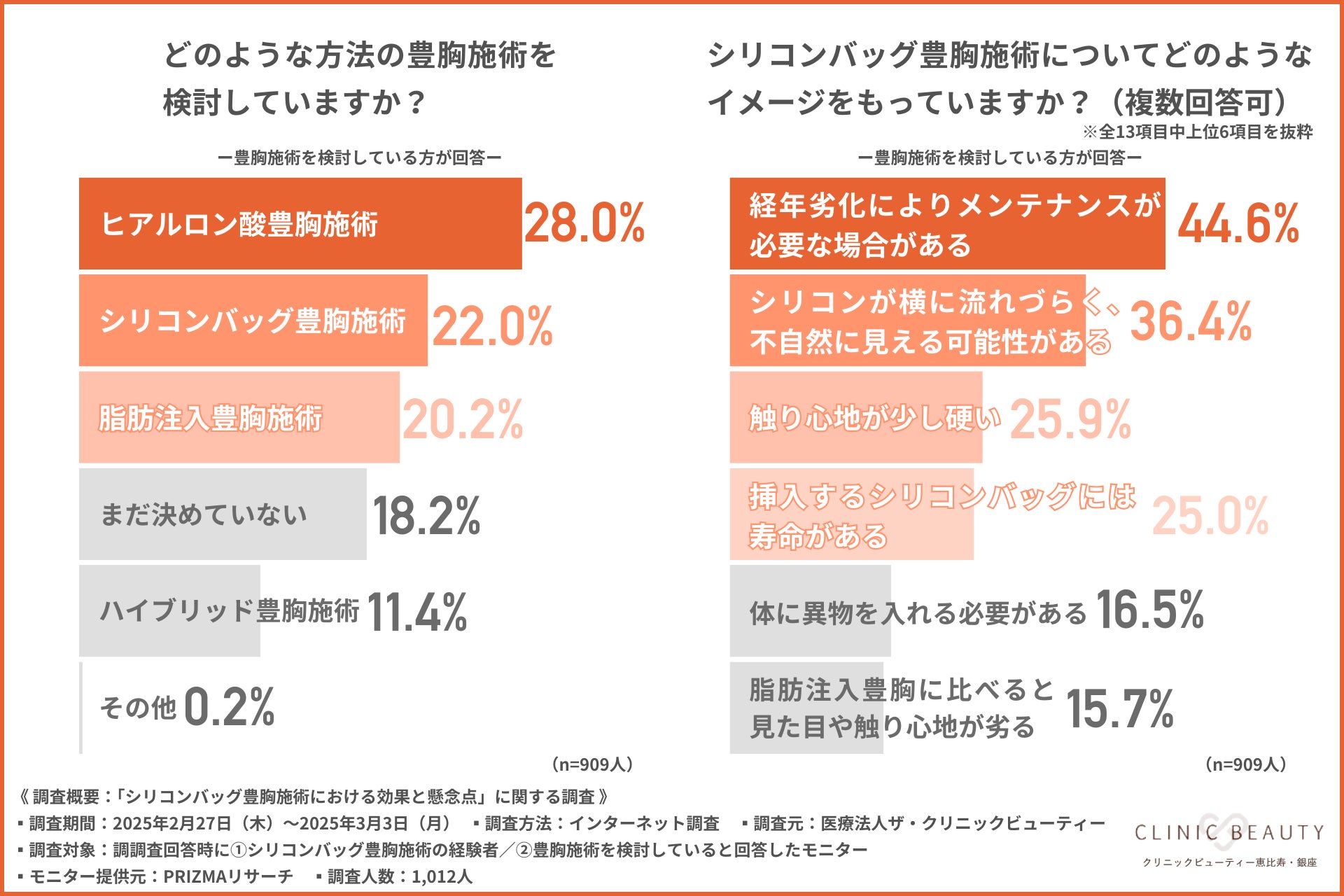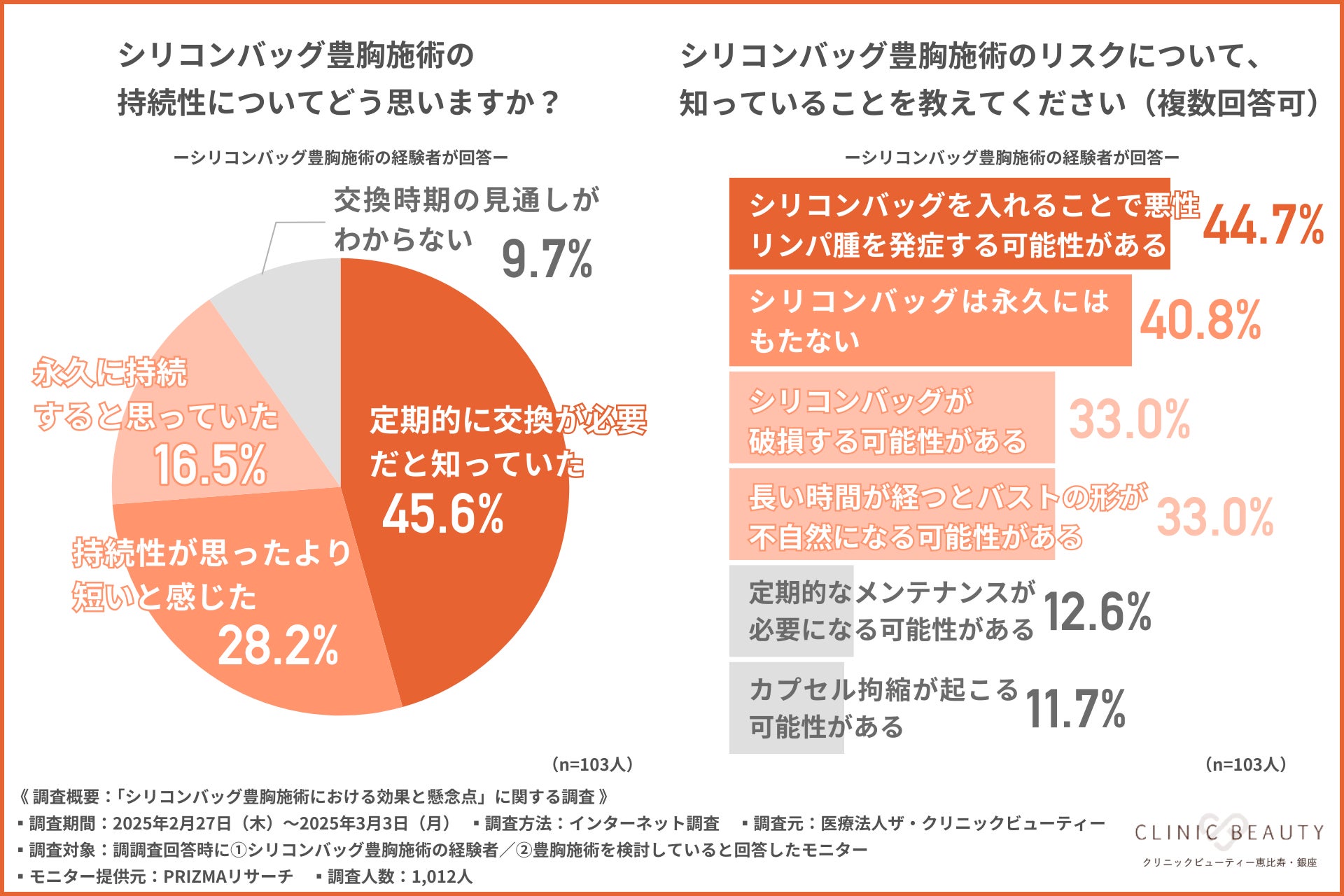 そこで今回、医療法人ザ・クリニックビューティー(https://the-clinic-beauty.com/)は、①シリコンバッグ豊胸施術の経験者/②豊胸施術(通称:豊胸手術)を検討している方を対象に、「シリコンバッグ豊胸施術における効果と懸念点」に関する調査を行いました。