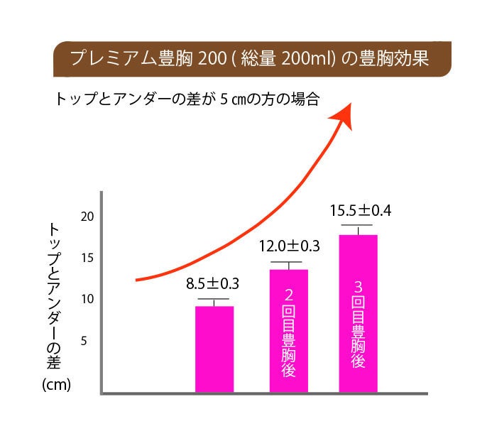 注入を重ねることで、例えば、トップバストとアンダーバストの差が約6cmの方が5~7cmのサイズアップを希望する場合、200mlのプレミアム200豊胸溶液を2回~3回注射すればおおよそご希望のサイズになります。