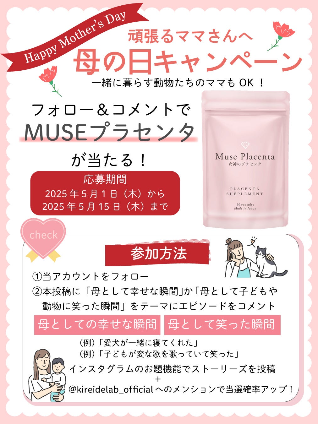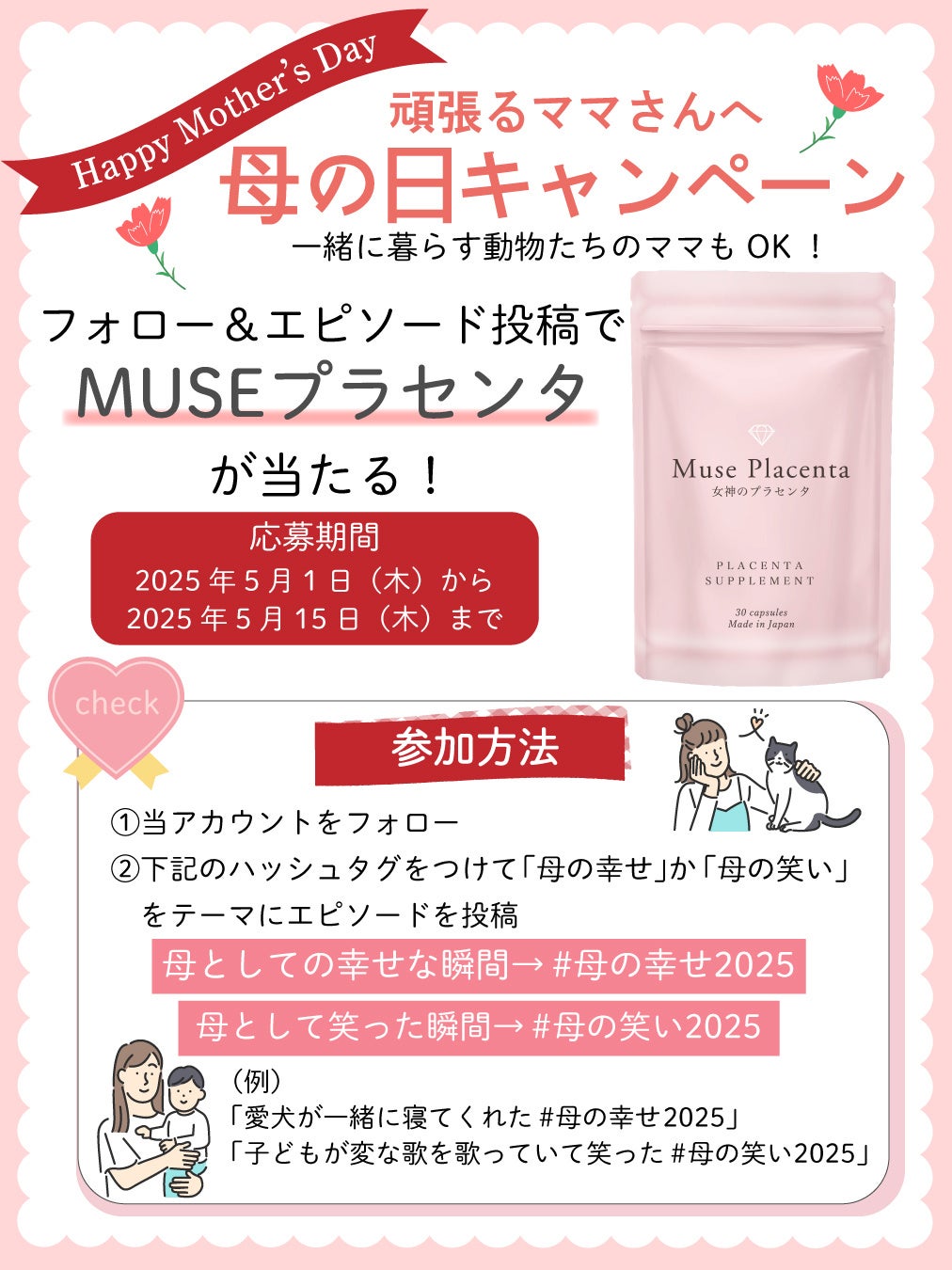 参加者は、XまたはInstagramでエピソードを投稿。抽選で合計20名様(各プラットフォーム10名)に、キレイと元気をサポートするプラセンタサプリ「ミューズプラセンタ」をプレゼントします。