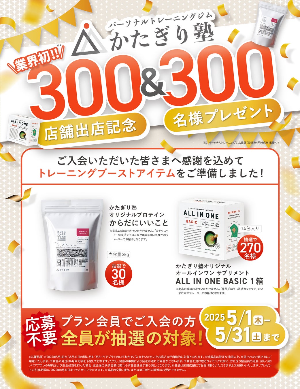 業界初の300店舗出店を記念し、感謝の気持ちを込めてプレゼント抽選キャンペーンを開催いたします。プラン会員として新規入会いただいたお客さま(応募不要で全員が対象)に、下記の賞品をプレゼントいたします。詳細はかたぎり塾公式サイトのお知らせをご確認ください。