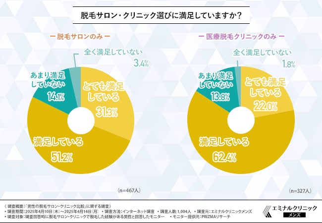 満足していると回答した割合は、医療脱毛クリニックのほうがわずかに高く、総合的に見て満足度で上回っていることが明らかになりました。