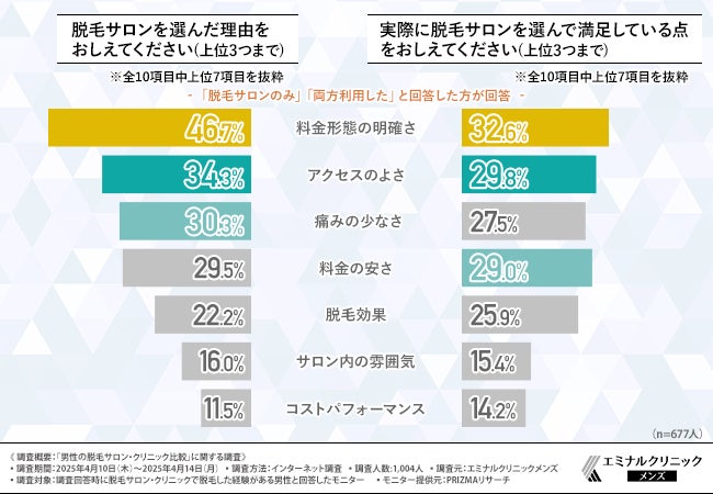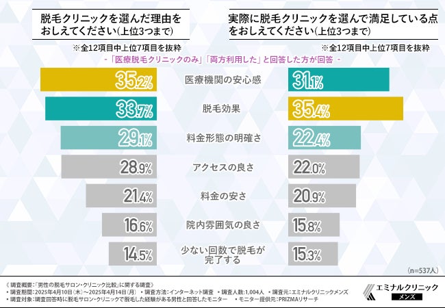 続いて、『医療脱毛クリニックのみ』『両方利用した』と回答した方に、「脱毛クリニックを選んだ理由」と「脱毛クリニックを選んで満足している点」をそれぞれ質問したところ、下記の結果となりました。