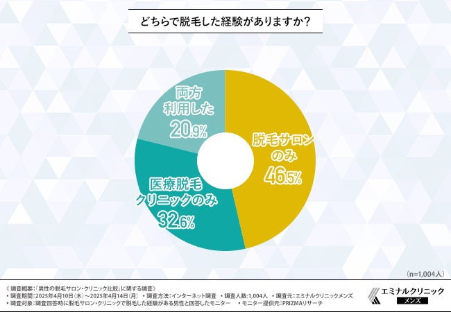 はじめに、「どちらで脱毛した経験がありますか?」と質問したところ、『脱毛サロンのみ(46.5%)』と回答した方が最も多く、『医療脱毛クリニックのみ(32.6%)』『両方利用した(20.9%)』と続きました。