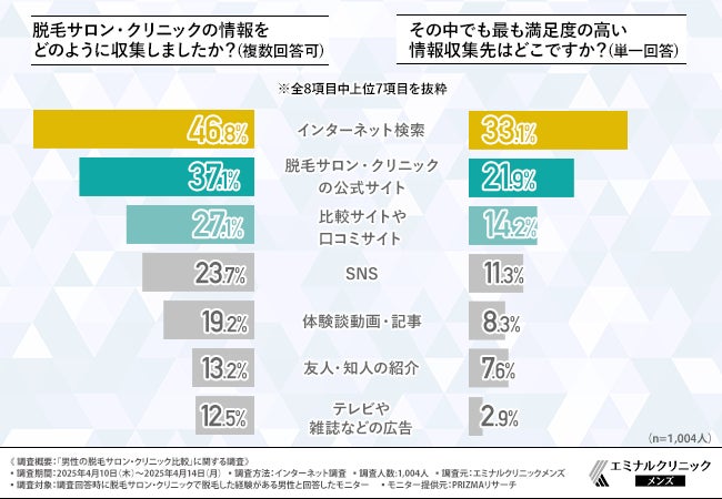 「脱毛サロン・クリニックの情報をどのように収集しましたか?(複数回答可)」「その中でも最も満足度の高い情報収集先はどこですか?(単一回答)」と尋ねたところ、下記の結果となりました。